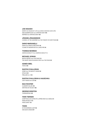 Afficher les morceaux... 14. the heart asks pleasure first from the piano [michael nyman] 15. home from the beauty inside [dustin o'halloran] 16. in the morning light [yanni] 17. le onde [ludovico einaudi] 18. light of the seven from game of thrones [ramin djawadi] 19. lion theme from lion [dustin o'halloran & hauschka] 2. at the ivy gate [brian crain]a 20. love [david foster] 21. merry-go-round of life from howl's moving castle [joe hisaishi] 22. metamorphosis two [philip glass] 23. a model of the universe from the theory of everything [jóhann jóhannsson] 24. nuvole bianche [ludovico einaudi] 25. one man's dream [yanni] 26. one summer's day from spirited away [joe hisaishi] 27. opening [philip glass] 28. opus 23 [dustin o'halloran] 29. penn ar roc'h [yann tiersen] 3. ballade pour adeline [richard clayderman] 30. porz goret [yann tiersen] 31. prelude no. 2 [dustin o'halloran] 32. primavera [ludovico einaudi] 33. reprise from spirited away [joe hisaishi] 34. the shape of water theme from the shape of water [alexandre desplat] 35. the tearjerker returns [chilly gonzales] 36. thanksgiving [george winston] 37. tokka [agnes obel] 38. una mattina [ludovico einaudi] 39. vladimir's blues [max richter] 4. big my secret from the piano [michael nyman] 40. written on the sky [max richter] 5. bluebird [alexis ffrench] 6. comptine d'un autre été, l'après-midi from amélie [yann tiersen] 7. dalur (island songs v) [ólafur arnalds] 8. dawn from pride & prejudice [dario marianelli] 9. fly [florian christl] |