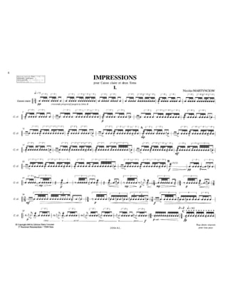 | |  | |  | |  | |  | |  | | NICOLAS MARTYNCIOW | | BRUNO GINER | | NICOLAS MARTYNCIOW | | RUPERT KETTLE | | ASKELL MASSON | | CHRISTIAN SITERRE | | Tchik | | Etudes de peaux n° 1 - et in terra pax hominibus bonae voluntatis | | Truc à Trac | | Four Solos For Snare Drum | | Kim For Snare Drum | | Parcours de Santé | | Caisse-claire | | Caisse-claire | | Caisse-claire solo | | Caisse-claire | | Caisse-claire | | Caisse-claire |