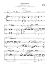 Three Pieces est une suite en trois mouvements pour trompette et piano. Le premier mouvement, assez rapide, rappelle un menuet classique et s’agrémente de nombreux ornements en doubles croches. Le deuxième mouvement est une ballade paisible en 4/4 dont le thème lyrique vient contraster avec les passages de style fanfare. La composition s’achève avec une tarentelle enivrante en forme de rondo.