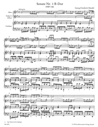 | HAENDEL 6 Sonaten HWV 380-385 - Heft 1 : 380-381 - Oboe Violine Oboe u. Bc Georg Friedrich Haendel Sonates : n° 1 HWV 380 en sib majeur – n° 2 HWV 381 en ré mineur / pour hautbois et violon (ou 2 hautbois) et basse continue / rév. Siegfried Flesch — Urtext der Hallischen Händel Edition —