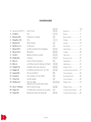 Destiné à des "fin de premier cycle", cet ouvrage de chant présente un large répertoire. De par le caractère et la diversité des styles musicaux (opéras, lieder, mélodies...), il a pour but la rencontre chronologique entre différentes époques et différentes formes musicales. La tessiture est adaptée aux voix des jeunes enfants, ainsi que les textes, au départ en allemand, italien, anglais ou russe, car des traductions sont systématiquement proposées. Au début de chaque chant, un petit commentaire propose de replacer la mélodie et son compositeur, dans un contexte historique. La chronologie a été respectée au plus près, tenant compte toutefois des contraintes d'une mise en page cohérente. Cet ouvrage est proposé avec un CD d'accompagnements musicaux, soit pianistiques soit instrumentaux et qui en fait son originalité.