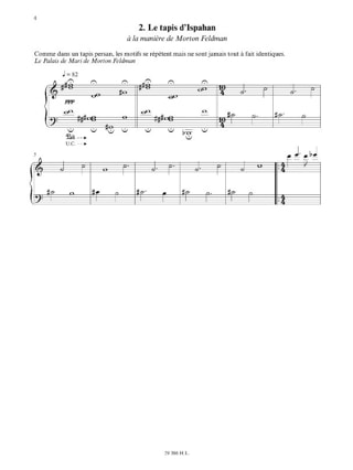 Afficher les morceaux... Le tapis d'ispahan (à la manière de morton feldman) Les cloches de la giudecca (à la manière de luigi nono) Tratteggiata (pointillés, à la manière de luciano berio) Un air lointain (à la manière de györgy ligeti) Versailles-varanasi (à la manière de mauricio kagel) |