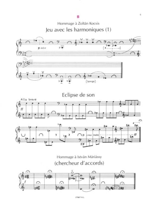 Afficher les morceaux... A petits pas Au bord du sommeil. gamme de 1 à 8 Avec les paumes Avec nonchalance Berceuse. hommage à bartok Chant nocturne des do. petit choral Coups Csardas fougueuse. en chahutant Eclipse de son (chercheur d'accords). hommage à mariassy En chancelant En flânant Exercices préliminaires au hoquet Fleurs nous sommes. tapotis Fleurs nous sommes... fleurs...aussi les étoiles ... en éventail Gazouillis Harmoniques mélancoliques. petit choral. fleurs nous sommes Hommage à ligeti. paumes en miroir Hommage à paganini (la nuova campanella) Hommage à peter eötvös Hommage à tchaïkovsky Hommage à verdi Hoquet Ici, fausses notes acceptées Jeu avec 3 doigts. galop Jeu avec les harmoniques (hommage à kocsis) Le lapin et le renard (takacs) Legato Méandres Micro-rondo Noeuds. fleurs nous sommes Objet trouvé. avec les avant-bras Perpetuum mobile (objet trouvé) Perpetuum mobile (objet trouvé) Pitreries. paumes silencieuses Portrait Prélude et valse en do Querelle. pantomime Sarabande. en éventail Son et bouquet de son Tape dans mes mains. fleurs nous sommes. quintes Valse. hommage à farkas. la grenouille de pierre avançait lentement |