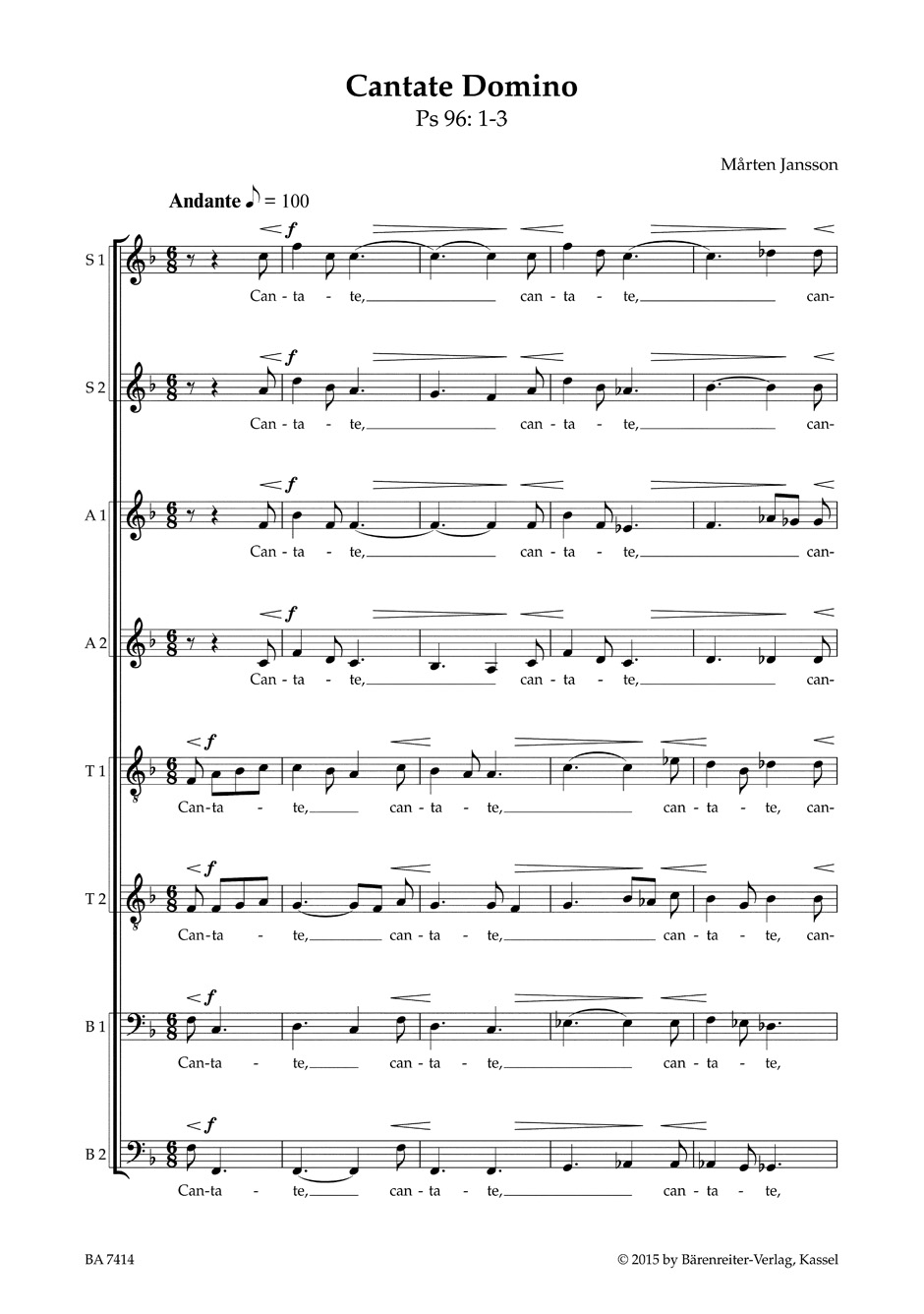 | Marten Jansson Cantate Domino Psaume 96: 1-3. Pour choeur mixte SSAATTBB a cappella original écrit pour choeur à voix égales d'hommes BA7416