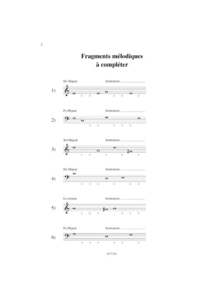 Les tests se divisent en: fragments mélodiques à compléter, fragments rythmiques à compléter , fragments mélodiques (dictées), fragments rythmiques (dictées), fragments mélodiques et rythmiques (dictées) à 1 et 2 voix. Pour chaque volume, les corrigés sont disponibles.